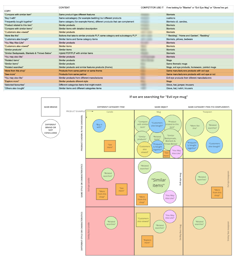 To better understand what products users could expect under different copies, I analysed the competitor’s carousel and the title they use for this component. I made a diagram showing how close the carousel results are to the product on the PDP under each copy. This table also helps visualise the language the competitors use in different algorithms. For example, “You may also like” suggests always the same product regardless of the characteristics. “See more” shows items from the same brand or partner.